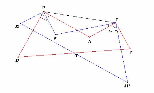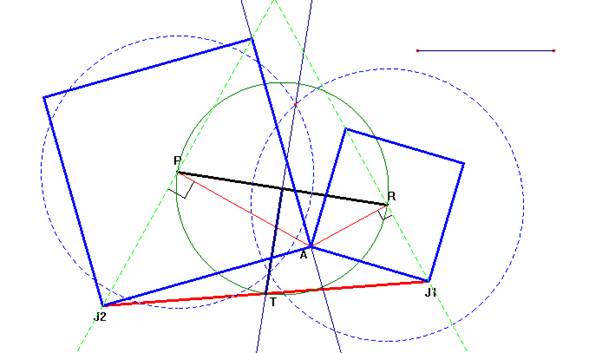2. “Dinamizando” el punto A, observamos que el punto T es invariante; es decir, los segmentos de la forma J1J2 tienen como punto medio a T. Por lo tanto, la ubicación del tesoro T es independiente de la posición del abedul A.