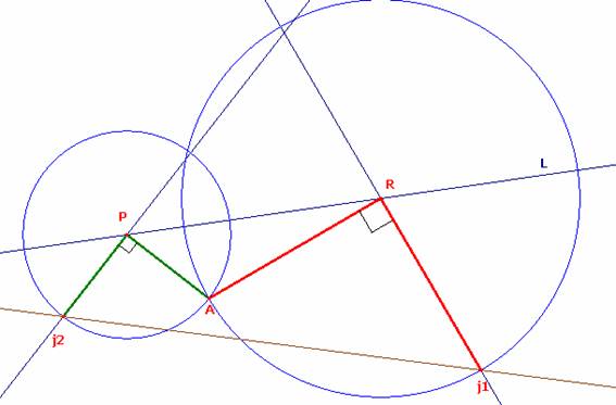 Según el problema levantamos perpendiculares por los puntos P y R a los segmentos PA y RA ubicados en el semiplano que contiene al punto A (abedul) de manera que PA=PJ2 y RA=RJ1