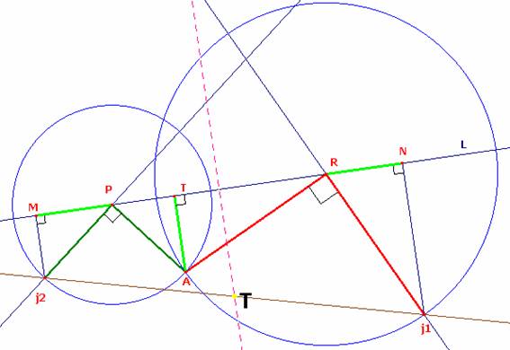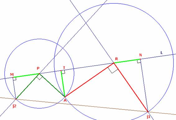 Luego trazamos las perpendiculares J2M, AT y J1N al recta L determinándose los triángulos iguales PMJ2=PAT y TAR=RNJ1 (LAL)