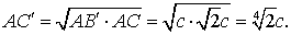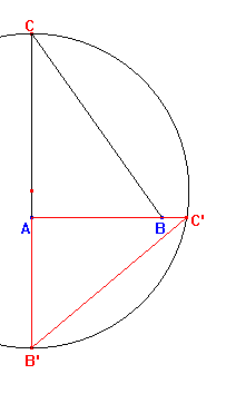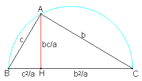 Comencemos por observar el hecho conocidísimo de que los triángulos ABC, HBA y HAC son semejantes, de donde es fácil deducir las medidas de los segmentos AH, BH y CH, mostradas en la figura. A la vez, el hecho de que AH2=BH·HB, da una construcción sencilla de la raíz cuadrada del producto de dos segmentos: Ponemos los dos segmentos sobre una recta, uno a continuación del otro, trazamos la circunferencia que tiene por diámetro al resultado de ello y levantamos por el punto de unión de los dos segmentos una perpendicular a la recta. Esta perpendicular corta a la circunferencia en un punto que determina un segmento cuya medida es la mencionada raíz cuadrada. |