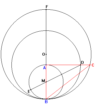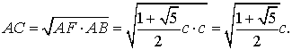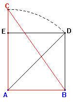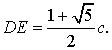 (Observemos de paso que el número que hay bajo la raiz grande es el número de oro.) Partimos de AB=c y hacemos AD=c perpendicular a AB. Siendo M el punto medio de AB y E el punto de corte de la recta DM con la circunferencia de diámetro AB, tal como se muestra en la figura, tendremos