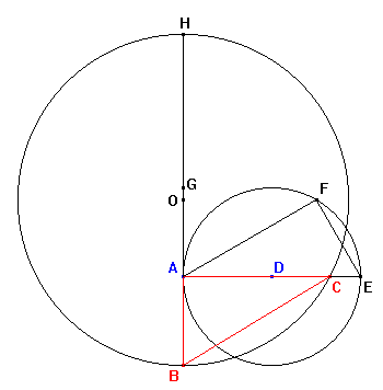 Para obtener la raíz cuadrada de este número prolongamos BA hasta F de manera que AF=DE y trazamos la circunferencia con diámetro BF. La perpendicular a BF por A cortará a esta circunferencia en el vértice C del triángulo buscado, pues