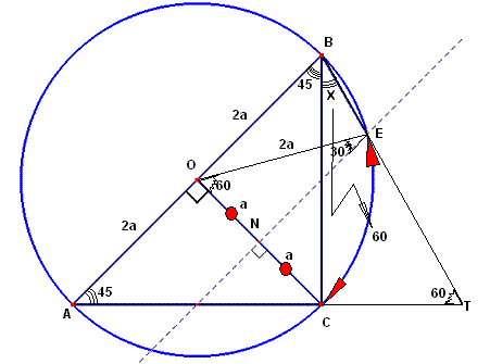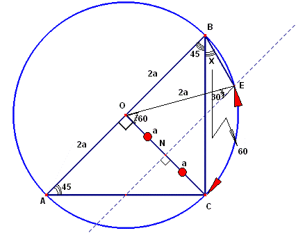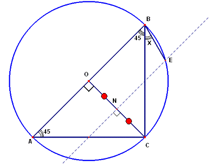 Sea: AO=OB=2 a; entonces. ON=NC=a, luego observamos que el triángulo ONE es notable de 30 y 60 por lo tanto el arco EC=60 y el ángulo x=30 (por ser ángulo inscrito)
