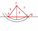 Fijamos el lado desconocido y pintamos la altura sobre él. Sabiendo que el extremo superior de la altura es el vértice C de los lados a y b cuyas medidas conocemos basta con hallar la intersección de los arcos de centro C y radio cinco y siete centímetros respectivamente.