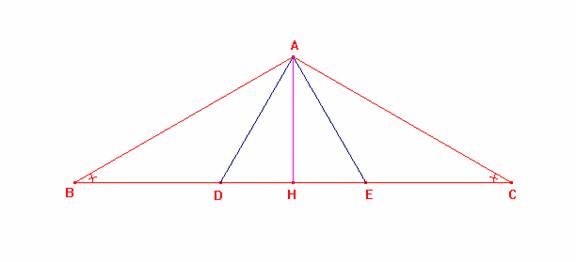 · Sabemos que BD = DE = EC y que, además, AB = AC y m (< ABD) = m (< ACE). Por criterio LAL, D ABD @ D ACE. Por tanto, AD = AE y el D ADE es isósceles. De modo que, AH, como altura del D ADE, biseca a la base DE. Así 2HE = DE. Esto es, 2HE = EC. Nótese que HC = HE + EC = HE + 2HE = 3HE. (2)