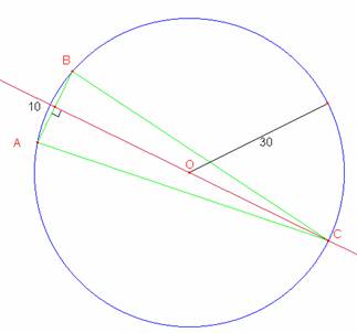 212. Calcular el área de un triángulo isósceles inscrito en una circunferencia de radio 30 dm y base 10dm.