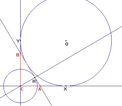 Por tanto, lo único que tenemos que hacer dados s y CH es dibujar el cuadrado CXOY de lado s, la circunferencia con centro O y radio s, la circunferencia con centro C y radio CH, y la tangente común a ambas circunferencias, que determinará con los lados CX y CY los vértices del triángulo buscado.