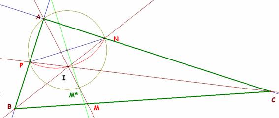 Según probamos en el problema nº 8 (circunferencia de Euler), la bisectriz de un ángulo y la mediatriz del lado opuesto se cortan en un punto de la circunferencia circunscrita. Aplicando esto, resulta que, cualquiera que sea la posición del vértice A sobre la circunferencia de diámetro PN, su bisectriz se corta con la mediatriz de PN en un punto fijo, M*. Conocido este punto, hallamos el vértice A trazando la recta que lo une con M.