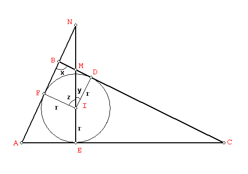 Tenemos que la recta por I, M, N pasa por E punto de tangencia del incirculo con AC. También D, F son puntos de tangencia del incirculo con BC, AB respectivamente.