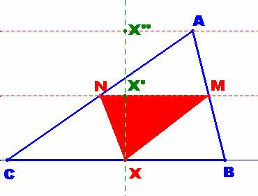 a) El triángulo XMN tiene un área que no depende del punto X, y, que es, 1/4 del área del triángulo ABC. Esto es cierto sin más que tener en cuenta que el lado MN es la paralela media a uno de los lados del triángulo. En la figura representada sería al lado BC.