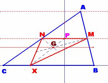 * El lugar geométrico de los baricentros será la recta paralela intermedia entre el lado MN y el lado del triángulo donde está X , situada a una distancia igual a1/3∙(1/2∙ha) a partir del punto P, punto medio de MN.