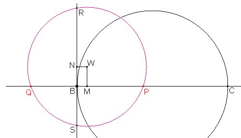 Con centro en W trazamos la circunferencia que pasa por R y S, que determinará los puntos P y Q sobre el eje BM.