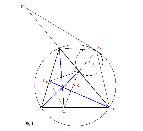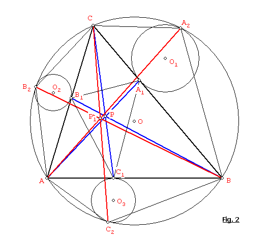 Esta última relación nos indica que se cumple el teorema de Ceva aplicado al círculo (O), entonces AA2, BB2, CC2 concurren en un punto P1. QED.