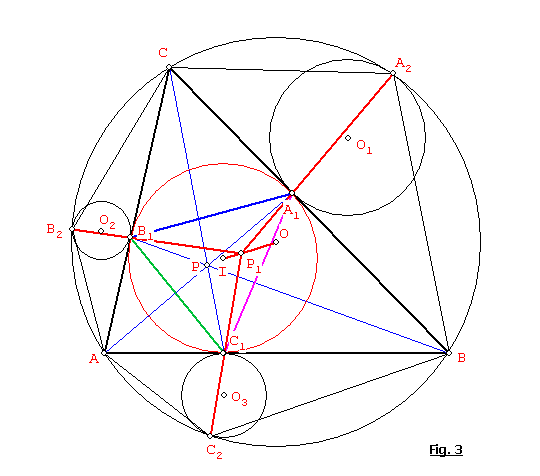 Podemos concluir además que el triángulo A3B3C3 es el triángulo mediano del triángulo excentral de ABC, igualmente también se cumple que los triángulos A3B3C3 y A1B1C1 son homotéticos porque sus lados son respectivamente paralelos. Por lo tanto el centro de homotecia (P1) es colineal con los centros del circuncírculo (O) e incírculo (I), o sea que A2A1 (A3A1) , B2B1 (B3B1), C2C1 (C3C1) pasan por el centro de homotecia P1, donde además la razón de homotecia es igual a la relación entre sus circunradios, es decir: P1I /P1O= r/R. QED.