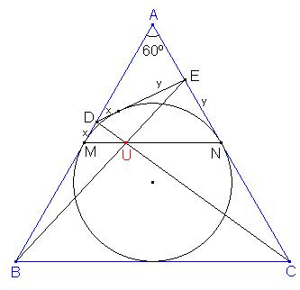 | Sea ABC un triángulo equilatero y Q su circunferencia inscrita. Sean D y E puntos de los lados AB y AC, respectivamente, tales que DE es tangente a Q por el arco más cercano a A. La intersección de BE y CD es U; se prolonga AU hasta cortar a BC en R. Demostrar que U es punto medio de AR. |