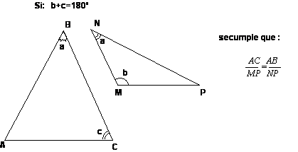 Si dos triángulos tienen un par de ángulos iguales y un par de ángulos suplementarios se cumple que los lados que se oponen a los ángulos iguales y los lados que se oponen a los ángulos suplementarios son proporcionales.
