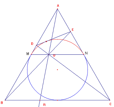 En el triángulo MN es paralelo al lado BC y como M y N son puntos medios entonces el segmento MN es base media de todos los triángulos BAR por lo tanto u será punto medio de AR con lo que da demostrado que U es punto medio de AR