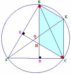 Análogamente el triángulo ACK es rectángulo : AK es diámetro de la circunferencia que coincide con la hipotenusa del triángulo en cuestión , luego m Ð ACK = 90° .