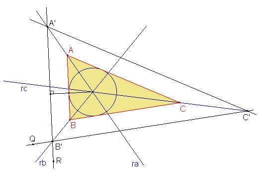 La circunferencia inscrita al triángulo A'B'C' será concéntrica a la circunferencia dada, así que todo lo que hay que hacer es aplicar al triángulo A'B'C' la homotecia que lleva una circunferencia en la otra. Para ello, trazamos una perpendicular a A'B' por el centro de la circunferencia dada, hallamos el punto de intersección de esta perpendicular con la circunferencia, y trazamos por ella una paralela a A'B' que determinará los vértices A y B al cortar con ra y rb. los lados AC y BC se obtienen trazando paralelas a A'C' y B'C' respectivamente.