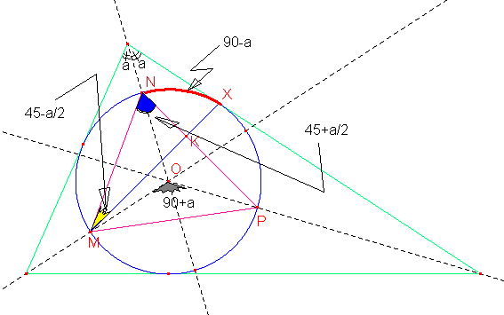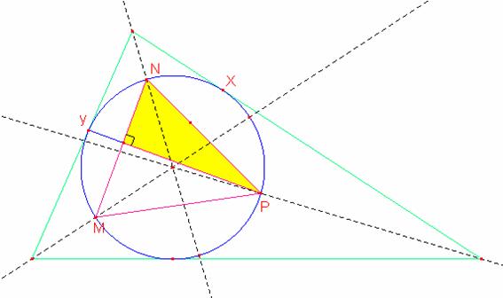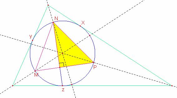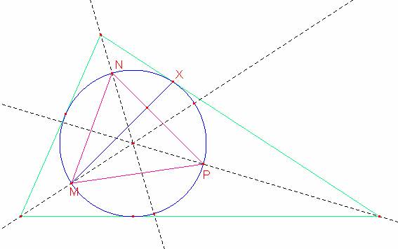 Primeramente trataremos de demostrar que los segmentos NP y MX son perpendiculares siendo M, N y P las intersecciones de las bisectrices con la circunferencia inscrita además observamos que X es punto de tangencia con uno de los lados del triángulo circunscrito.