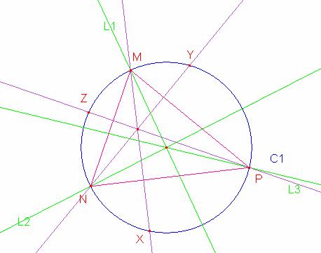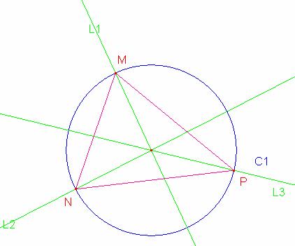 Definitivamente las rectas dadas serán las bisectrices de los ángulos del triángulo circunscrito luego estas bisectrices cortan a la circunferencia en los puntos M, N y P
