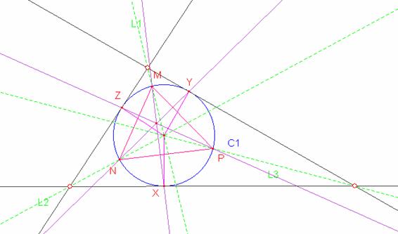 Entonces trazamos por los puntos X, Y y Z las tangentes a la circunferencia determinándose los vértices del triángulo en y ubicados cada uno sobre las retas dadas