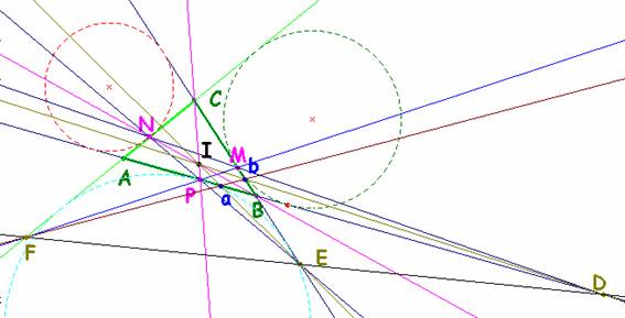 Los puntos M, N y P son los extremos de las cevianas llamadas escisores que dividen al triángulo ABC en dos triángulos de igual perímetro, según se vió en el problema nº 131. Los escisores concurren en un punto, llamado punto de Nagel. Así pues I es el punto de Nagel del triángulo.
