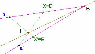 Tomando X=D, su homólogo en la proyección es X’=E. La recta aE corta al eje, recta IB, en el punto I; a’ es la proyección de D sobre BC desde I, es decir, a’ = IDÇBC = b como se quería demostrar.