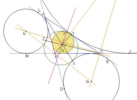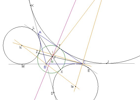 Los excírculos (Ia), (Ib), (Ic) determinan con el círculo de los nueve puntos (centro N, radio r) del triángulo ABC los puntos de tangencia X, Y, Z respectivamente. Además (D, E),(K, J),(M, L) son los puntos de tangencia sobre (AB, AC), (BA, BC), (CB, CA) con los excírculos (Ia), (Ib), (Ic) respectivamente. Probar que: