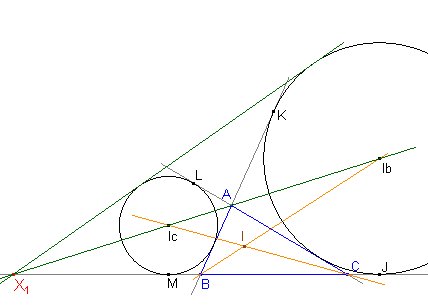 Veamos que esta es también la recta de Monge de los tres excírculos. Para ello calculamos, por ejemplo el punto X1 de intersección de la recta IbIc con la recta BC, que será el punto de corte de las dos tangentes exteriores a las circunferencias (Ib) e (Ic).