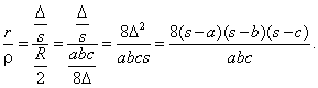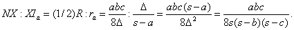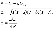 Llamando ra al radio de la circunferencia exinscrita con centro Ia, y D al área del triángulo ABC tenemos las relaciones: