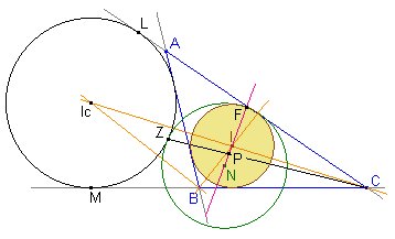 Hemos destacado los puntos de contacto F y Z de la circunferencia de los nueve puntos con la circunferencia inscrita y con la circunferencia exinscrita correspondiente al vértice C, respectivamente.