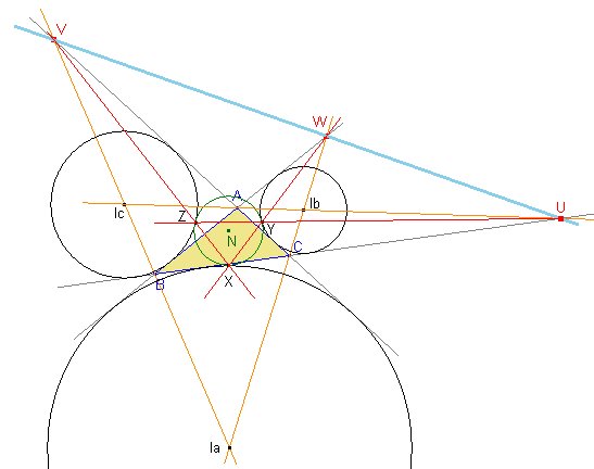 Pero si consideramos las circunferencias (Ia), (Ic), y la circunferencia de los nueve puntos tenemos que V es el centro de semejanza directo de (Ia) e (Ic), X es el centro de semejanza inverso de (Ia) y la circunferencia de los nueve puntos, y Z es el centro de semejanza inverso de (Ic) y la circunferencia de los nueve puntos. Por tanto X, Z y V están alineados. Esto indica que ZX e IcIa se cortan en V.