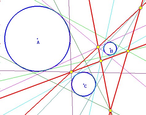 Como consecuencia, los seis centros de semejanza están alineados tres a tres en cuatro rectas: