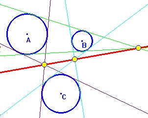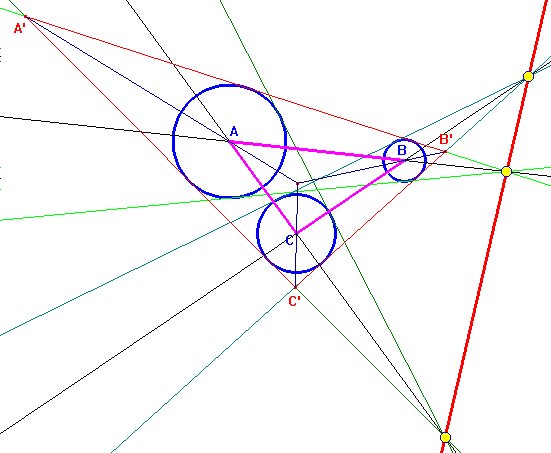 La demostración para el caso de los tres centros de semejanza directos usando el teorema de Desargues que reproducimos aquí está tomada de la web de Alexander Bogomolny. Considerando el triángulo A'B'C' formado por las tangentes exteriores, resulta que AA', BB' y CC' son sus bisectrices interiores, por lo que se cortarán en un punto, el incentro de A'B'C'. Por tanto, según el teorema de Desargues, los puntos de intersección de AB y A'B', BC y B'C', y CA y C'A' estarán alineados.