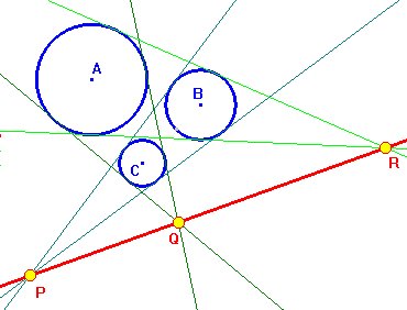 Sean P, Q, R los centros de homotecia de las circunferencias (B,C), (C, A) y (A, B). Al girar el par de circunferencias (B, C) alrededor del eje PBC obtenemos las esferas B, C y su cono tangente con vértice en P. Algo parecido ocurre con los otros pares de circunferencias. Ahora consideremos dos planos E y F tangentes a las tres esferas, todas ellas quedando por el mismo lado de cada plano (podemos imaginar que las esferas están sobre el plano de una mesa y que ponemos un folio de papel sobre ellas). Como los tres conos serán tangentes a las a los planos, estos contendrán a los vértices y por tanto los tres vértices P, Q, R estarán en la recta de intersección de los dos planos. |