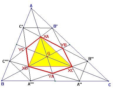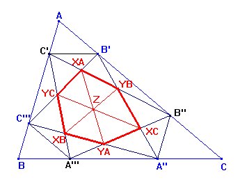 construyen los triángulos T(A)=AB'C', T(B)= BA''' C''', y T(C)= CA''B'', semejantes al triángulo dado con B' y B'' sobre AC, C' y C''' sobre AB, y A'' y A''' sobre BC, sin ser puntos medios de los lados del original ninguno de los construidos. Construimos los siguientes puntos definidos por las intersecciones de los pares de rectas que se indican: X(A) = B'C''' Ç B''C'; Y(A) = A'' C''' Ç A'''B'' ; X(B) = A'' C''' Ç C'A'''; Y(B) = A'' B' Ç B'' C'; X(C) = B'' A''' Ç A'' B', Y(C) = B'C''' Ç C'A'''. Probar que : a) Las rectas X(A)Y(A) ; X(B)Y(B) ; X(C)Y(C) son concurrentes. A partir de ahora se considera que los triángulos T(A), T(B) y T(C) tienen la misma razón de semajanza respecto a ABC. b) Las rectas X(A)Y(A) ; X(B)Y(B)