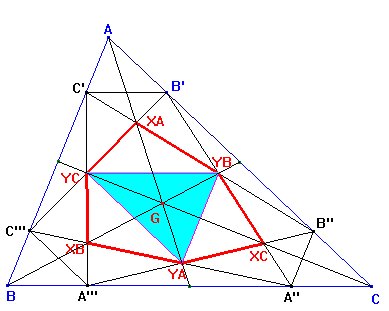 Para hallar el área del hexágono X(A)Y(B)X(C)Y(A)X(B)Y(C), añadimos al área D del triángulo Y(A)Y(B)Y(C) las áreas DA del triángulo X(A)Y(C)X(B), DB del triángulo X(B)Y(A)Y(C) y DC del triángulo X(C)Y(B)Y(A). Por una cuestión de simetría, estas tres áreas valen lo mismo. Entonces, para hallar el área del hexágono X(A)Y(B)X(C)Y(A)X(B)Y(C) hacemos: