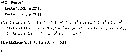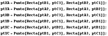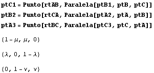 Ahora calculamos los puntos C', B" y A''', aunque también podemos deducir sus coordenadas por "simetría", teniendo en cuenta el concepto de coordenadas baricéntricas: