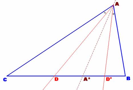 Examinamos, en primer lugar, una propiedad que nos va a conducir de forma inmediata a la solución del problema dado. Dada la figura siguiente, donde AA* representa la bisectriz interior del ángulo A, construimos AD’, recta isogonal[1] a la ceviana AD dada. Veamos la relación que determinan dichas cevianas sobre el lado opuesto BC.