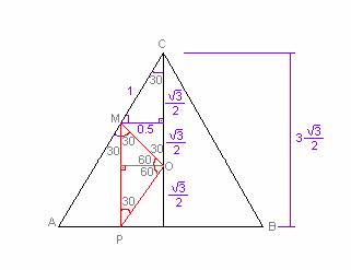 La altura del triángulo es 3sen (60º), y sabemos que el punto medio del triángulo equilátero está a 1/3 de la base y 2/3 del vértice, sobre la altura. Sabemos que el punto M está a distancia sen (60º) del vértice C y a cos (60º) de la altura. Luego la distancia “vertical” entre los puntos M y O es sen (60ª) Conocidas estas relaciones, deducimos que los ángulos del triángulo PMO son 30º; 120º y 30º, como se puede observar en la figura.