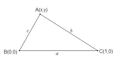 Para hallar los triángulos que anulan el otro factor del numerador, consideramos que nuestro triángulo tiene su vértice B en el origen de coordenadas, el vértice C en el eje de abscisas y el vértice A en un punto variable (x,y). Realmente la única limitación que hemos impuesto es a=1, aunque dicha limitación será fácil de salvar.