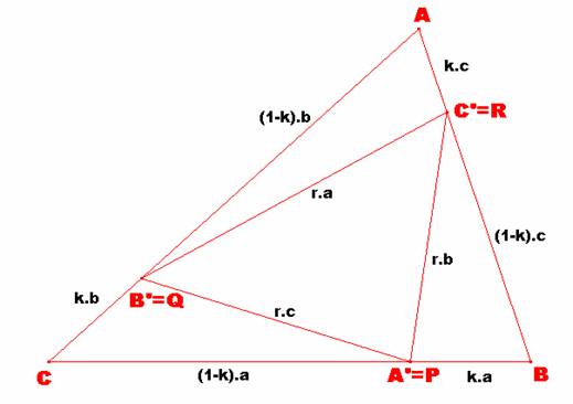 que [AB'C'] = [A'BC'] = [A'B'C] = k×(1-k)×S, tenemos que: [A'B'C']=S-3× k×(1-k)×S =S× (3k2-3k+1)