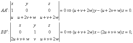 De forma simétrica obtenemos A' = (u, u + 2v + w : u + v +2w), B' = (2u + v + w : v : u + v + 2w).