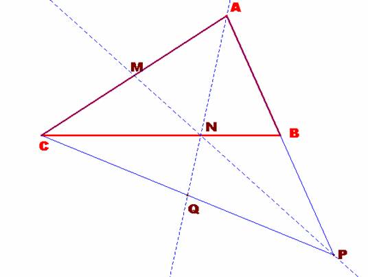 La transversal MN determina el punto P en el lado AB y por el Teorema