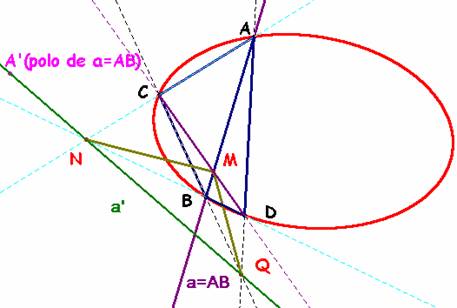 El triángulo diagonal MNQ de este cuadrivértice es autopolar, lo que significa que los puntos N y Q yacen sobre la recta a’ polar de M. Asimismo la polar de N es la recta MQ y la de Q es MN: los puntos N y Q son conjugados respecto de la cónica, como se quería demostrar.