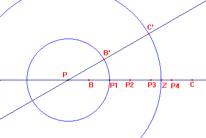 Sobre la primera recta señalamos un punto B, de manera que PB es el segmento unidad, y a partir de el usando repetidamente la simetría respecto de un punto obtenemos los puntos P1 simétrico de P respecto de B, P2 simétrico de B respecto de P1, etc hasta C, simétrico de P4 respecto de P3. Con centro P y radio PP1 trazamos una circunferencia que corta a la segunda recta en B', y con centro P y radio PZ siendo Z el punto medio de P3P4 trazamos otra circunferencia que cortará en C' a la segunda recta.
