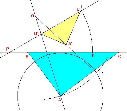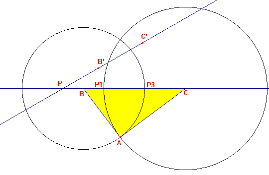 Usando B y C como centro y radios BP3=3 y CP1=4 obtenemos dos circunferencias que se cortarán en los posibles vértices A. Aquí hemos puesto el que queda separado de B'C' por la recta BC.