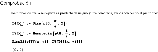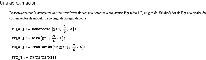 Por tanto, los triángulos OBC y OB'C' son semejantes y el triángulo OB'C' es el resultado de aplicar al triángulo OBC primero un giro y después una homotecia, ambos con centro O. El giro tendrá amplitud ÐBOB' =ÐCOC' =30º que es el ángulo formado por las rectas BC y B'C'. La homotecia tendrá razón 1/2, que es el cociente entre las longitudes B'C' y BC.