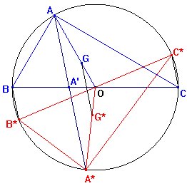 Hemos dicho que siempre el triángulo A*B*C* es el simétrico de ABC respecto de la mediatriz de AA* . El circuncentro O es común a todos los triángulos. Entonces: c1) El lugar de G* será una circunferencia con centro O